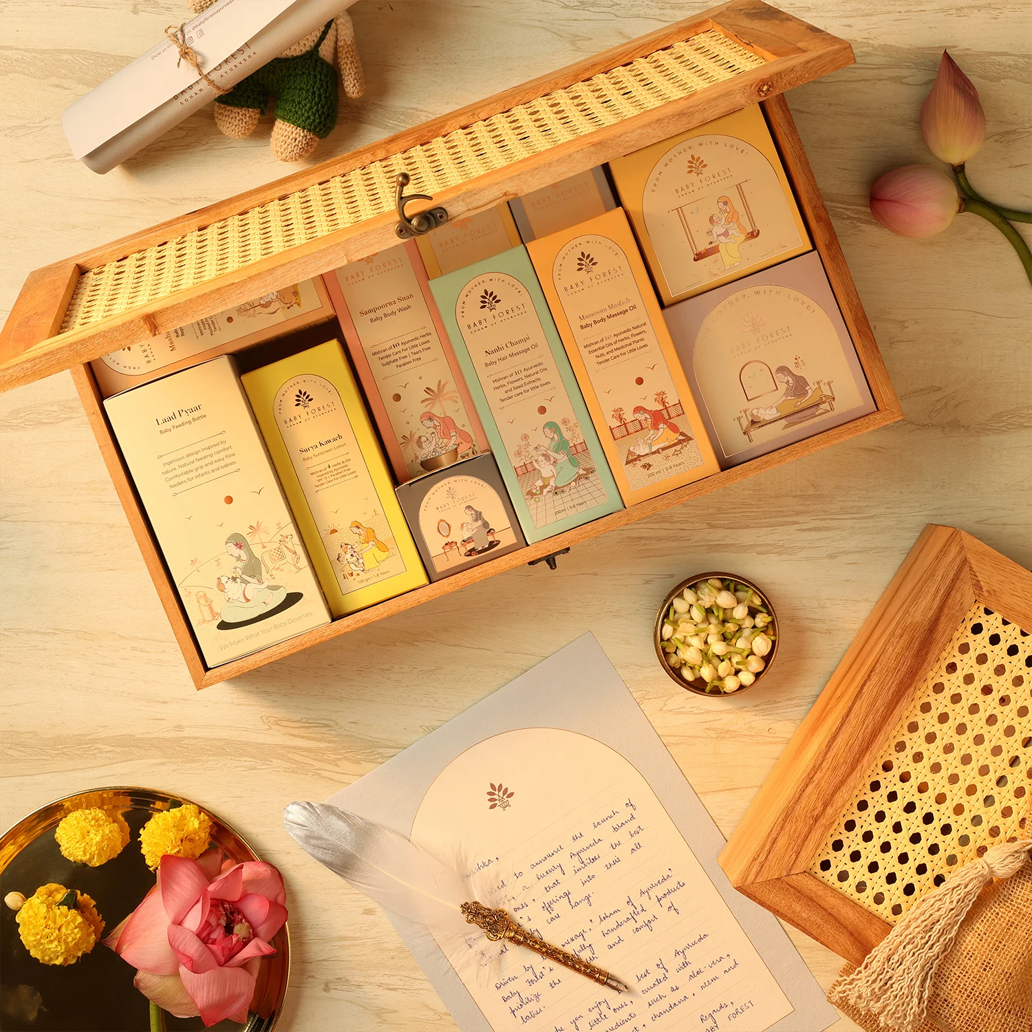 Still looking for a warm, welcoming gift for the baby? Celebrate the baby's special days by gifting the hand-curated hamper from Baby Forest. Ensure the new parent's journey with Ayurvedic and tender care for their little one, shielded with essential oils, seed extracts, and natural ingredients packed in a beautifully hand-crafted wooden box.